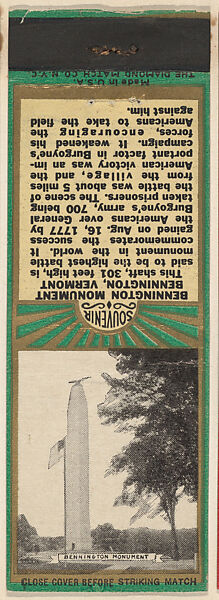 - Title: Bennington Monument from New England, Souvenir Views Match Cover series (U40.7)