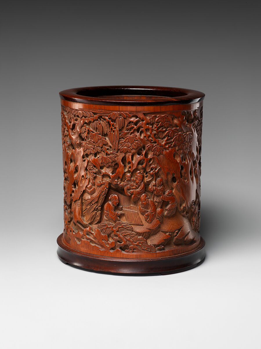 Features such as the gourd held by a standing attendant, the peach blossom clasped by another, and the individual riding on the back of a deer suggest that the figures on this brush holder represent tales of people who visited the mountains, inadvertently entered other realms, and transgressed time, respectively. The two gentlemen playing chess may refer to a story about two individuals who played the game for so long that the eggs they had in their pockets disintegrated.