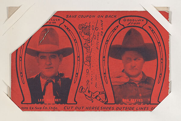 From 1929 Western Cowboys Exhibits Novelty Star Designs Double Horseshoes (W435). Distributed by Exhibit Supply Company. Dispensed in arcade machines. Postcard-sized thick card. One color. Two horseshoes with different western stars pictured. Printed at top of each horseshoe: GOOD LUCK from. Postcard back with corner coupon. At top: SAVE COUPON ON BACK. Across bottom: © 1929 Ex. Sup. Co., Chgo. CUT OUT HORSESHOES OUTSIDE LINES ONLY.