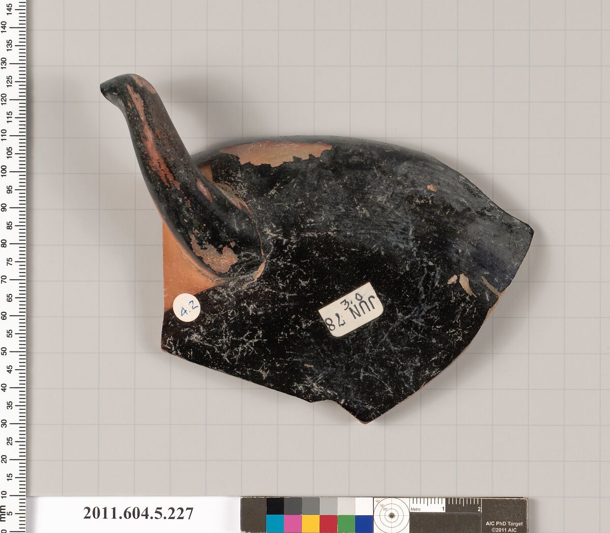 Exterior, black glazed rim fragment with part of the handle patch and the right half of the handle
