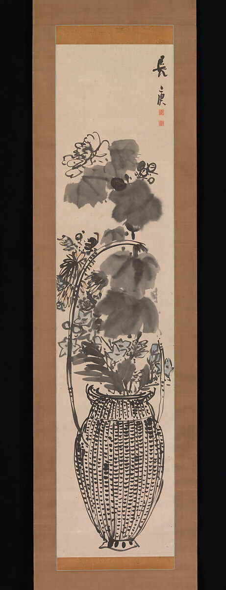 An informal bouquet of autumn flowers stands in a tall Chinese-style bamboo basket with an elegant rounded handle. Chrysanthemums (kiku), Chinese bellflowers (kikyō), and rose mallows (fuyō) are all associated in traditional Japanese poetry with autumn, their season of full bloom. The Nanga-school artist Yosa Buson styles himself “Chōkō” in his signature, indicating that he painted this in his mid- to late forties. To render the flowers, he used the sumi-nijimi, or “ink blurring,” technique, in which the artist applies brushstrokes to the surface of ink washes before they have dried, creating an evocative, softly textured effect. This contrasts with the short horizontal strokes in dark ink with which Buson conveyed the bamboo basket’s plaiting.