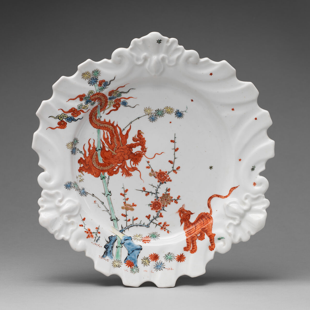 - Title: Plate decorated with Japanese Kakiemon-inspired scene with twisted dragon