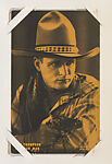 From Western Stars or Scenes Exhibit From Western Stars or Scenes Exhibit Cards series (W412). Distributed by Exhibit Supply Company of Chicago. Dispensed in arcade machines. Postcard-sized thick card. Yellow toned.