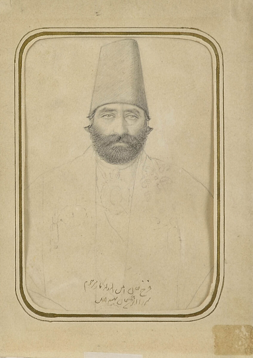 This small pencil drawing is a portrait of Farrukh Khan Amin al-Dawla (1812–71), a reform-minded high-ranking Qajar official from Kashan under Nasir al-Din Shah Qajar (the fourth ruler of the Qajar dynasty, 1848–96). Painted by the renowned court painter, Abu’l Hasan Ghaffari, known as Saniʿ al-Mulk, it represents a glimpse into the artist’s practice, as it may have been a preparatory drawing for a painting. It shows the artist’s deft hand at producing sensitively rendered portraits of extraordinary immediacy that reflect an interest in photography and European conventions of portrait painting.