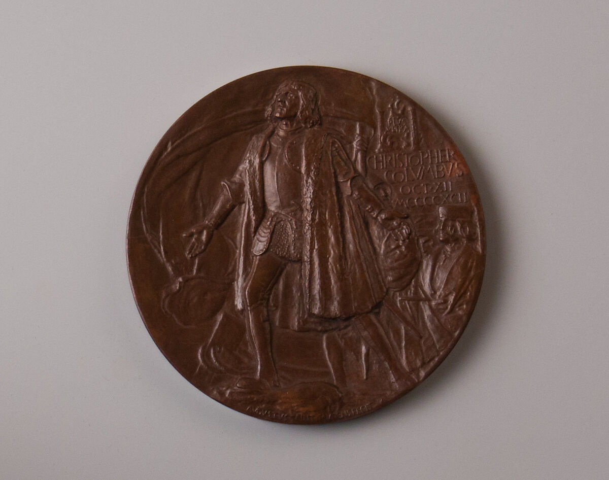 The reverse of the final minted version features a central tablet with an inscription and a space for a drop-in die with the name of the recipient. The tablet is flanked by flaming torches symbolizing light or intelligence, and below it the Santa Maria appears at full sail. Above, two winged (and ironically bare-breasted) females hold symbolic attributes—a trumpet and laurel wreaths and a stylus and a blank tablet—that celebrate the award recipient. The hubs and dies for the medal were produced at the United States Mint in Philadelphia and farmed out for striking to the Scoville Manufacturing Company of Waterbury, Connecticut. The medal was finally awarded to recipients in 1896. This example was awarded to Candace Wheeler (1827-1923), leader of the renowned all-women interior and textile design firm Associated Artists. The firm had a large exhibition of its works in the Woman’s Building at the 1893 Exposition. The medal retains its original velvet-lined aluminum travel case.