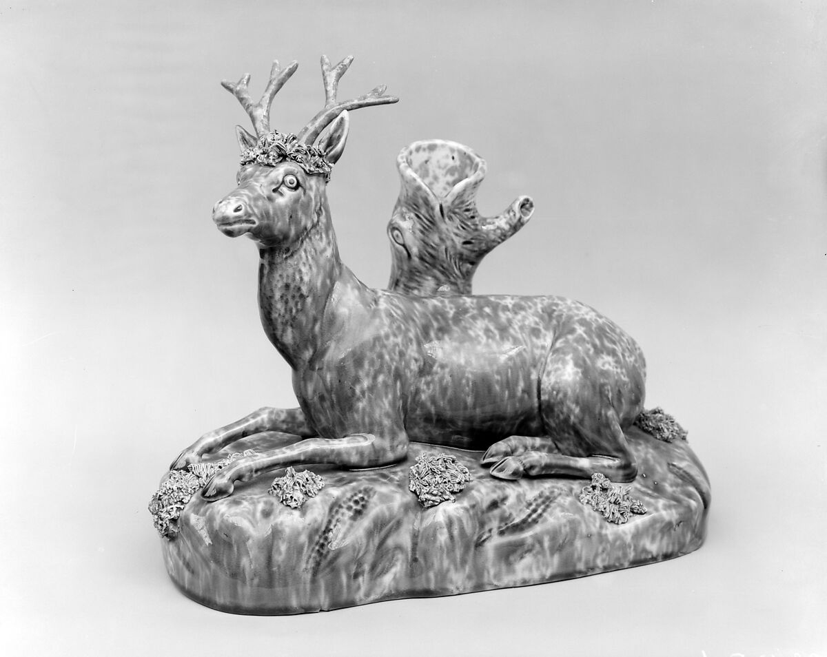 The middle of the nineteenth century witnessed a proliferation of relief-molded earthenware covered with an allover mottled brown enameled glaze. Often referred to as Rockingham ware in homage to similar ware first produced in England on the property of the marquis of Rockingham, many of the original molds and designs were brought from England by itinerant potters who fashioned these wares. Variations occur in the glazes by the means of application—dipping, sponging, or splashing—and with the addition of colored oxides. Relief-molded pitchers were the most common forms, but slip-cast animal figures such as a recumbent cows, lions, poodles, and deer, were also popular. This figure of a reclining stag on a base is one of a pair; its complimentary mate is a doe. The two opposite-facing figures were intended as mantel ornaments. The hollow tree trunk behind the stag was used to hold paper or wood spills for lighting candles or oil lamps.