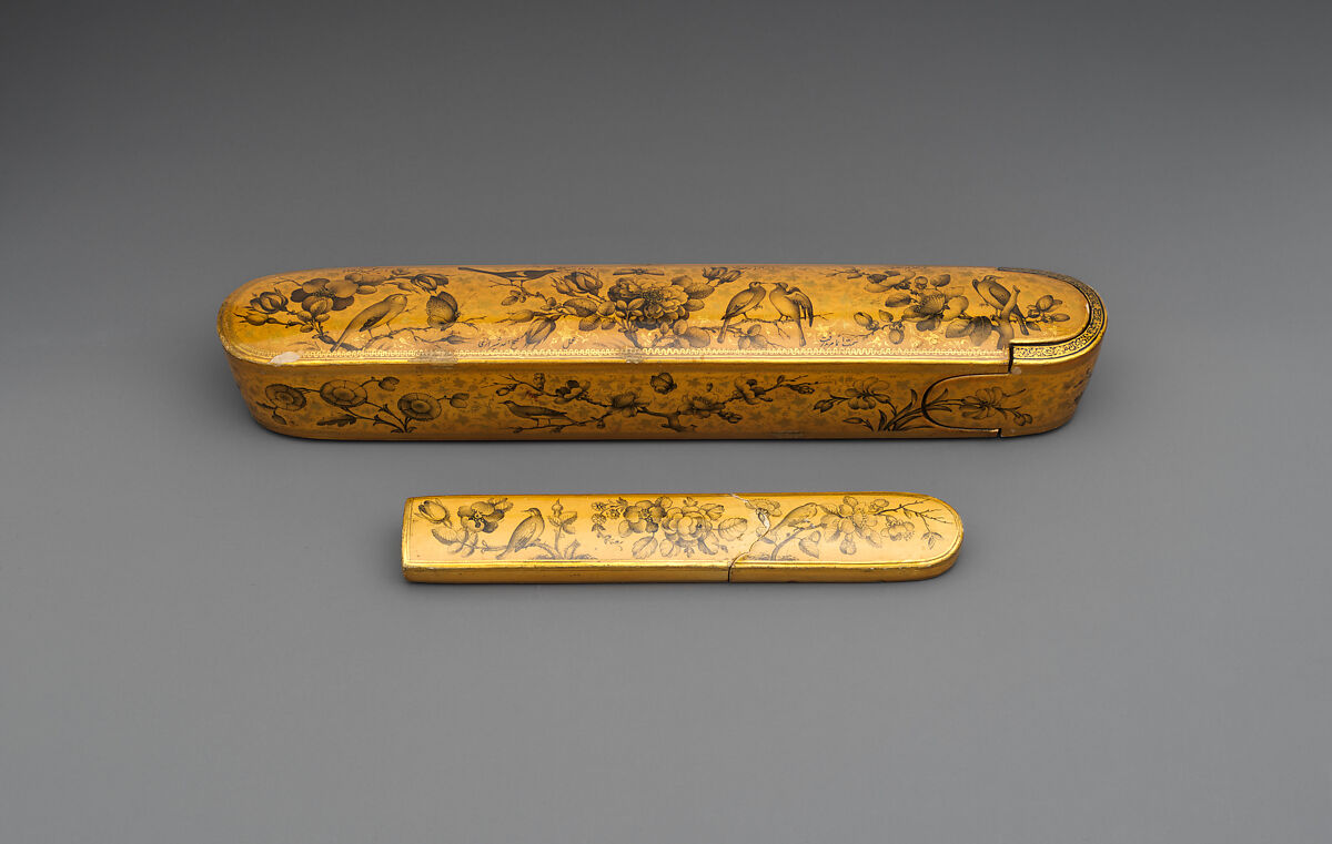This penbox, by one of the great lacquer painters of the second half of the nineteenth century, is decorated in the artist's signature gul-u-bul-bul (rose and nightingale) style in a palette of beige, gold and black. It contains a small spectacle case with the same decorative motif that fits into the sliding compartment. The inscription, which appears at the top and bottom edges of the lid, tells us that it was made for the Qajar prince, Kamran Mirza, who was the third son of the ruler, Nasir al-Din Shah (r.1848–96).