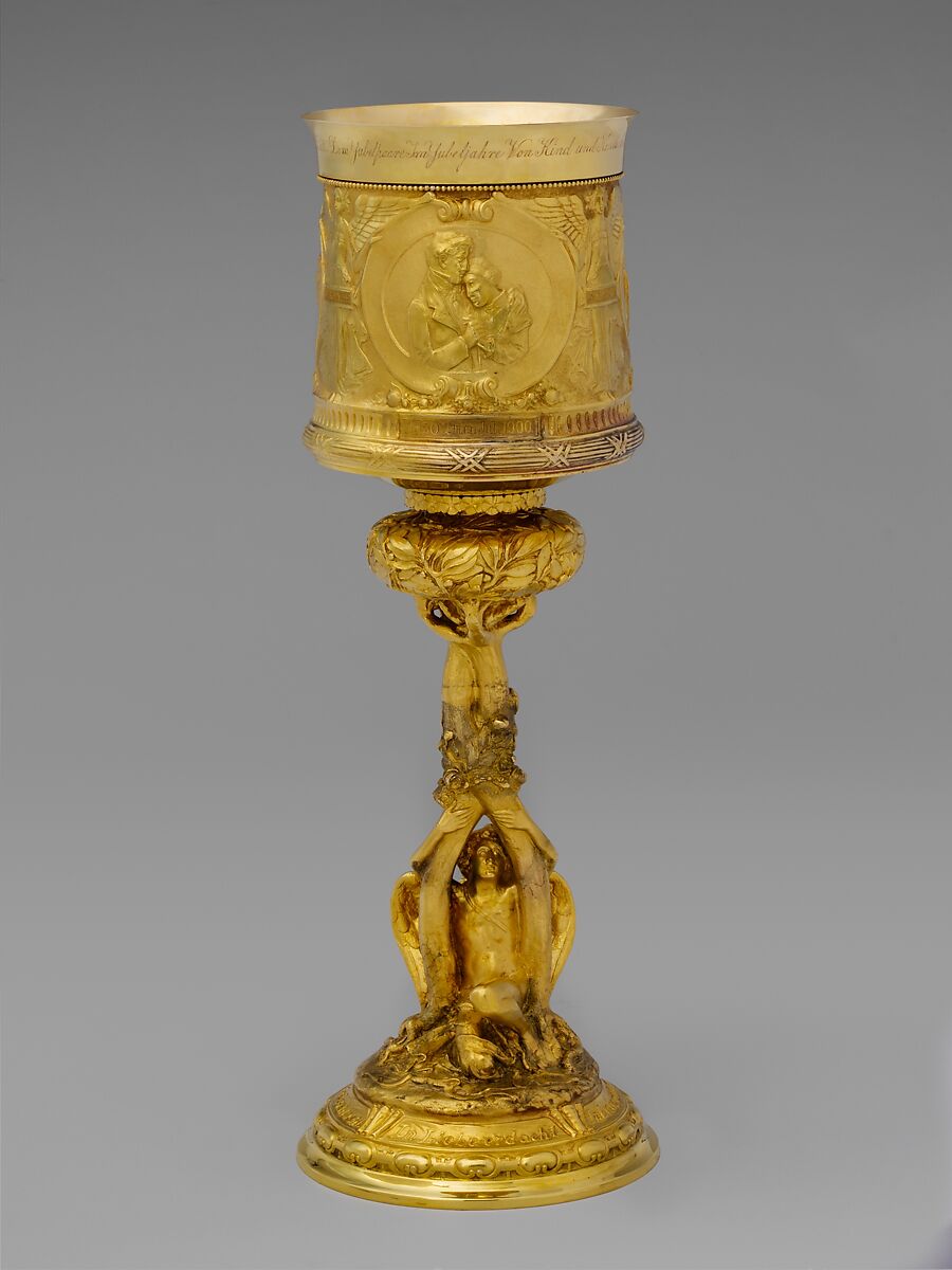This chalice epitomizes Beaux-Arts sensibilities, particularly in its classical vocabulary and meticulous carved and repoussé ornament. It was made for the golden wedding anniversary of Marcus and Bertha Goldman, the donor's grandparents, and the scenes in the medallions chronicle the couple’s married life. Eros, embracing the trunks of two intertwined trees, is seated on the base as a symbol of the couple’s enduring love.