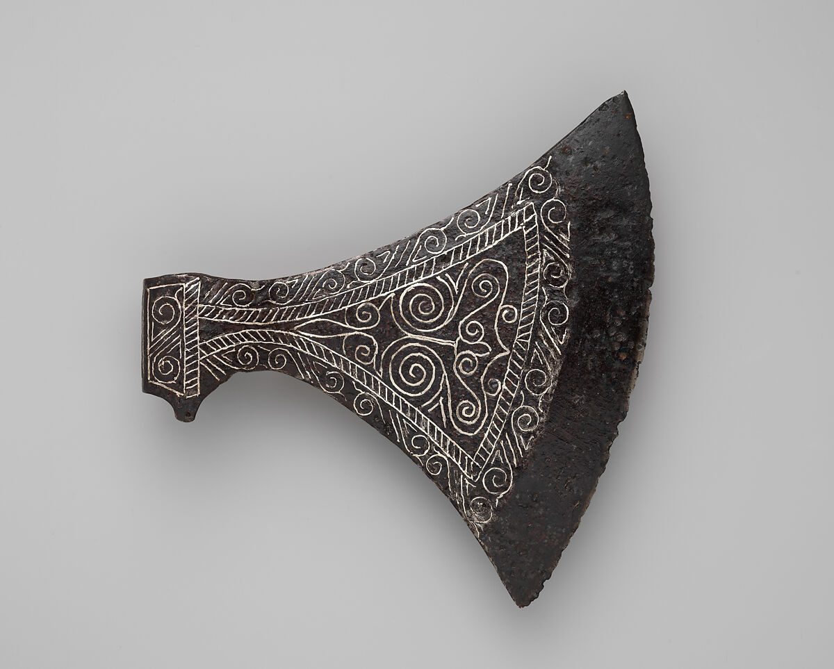 Although the collection of the Department of Arms and Armor numbers approximately 14,000 objects, the Museum has comparatively few examples of early medieval European armor or weapons, and even fewer with a large degree of decoration or in non-excavated condition. This Scandinavian axe head, therefore, makes an important addition to the collection as a fine medieval piece and in particular for being the first elaborately decorated Viking axe head to become part of the permanent collection. Decorated weapons – swords, axes, spears – were the most highly valued possessions of Viking men, essential as symbols of their rank and status within society, in addition to serving as functional fighting equipment. This axe head is an excellent example of the broad axe form, and is rare and significant for the extent and intact state of its scrollwork ornament, richly inlaid in silver wire.