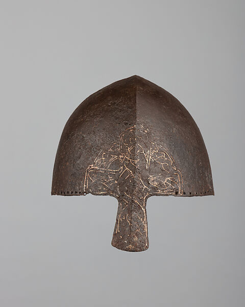This work of art is currently on loan to the museum.Although nasal helmets (a type that covers the top of the head, with a bar extending down from the brow to protect the nose) were widely used in medieval Europe, this is one of only a handful that survive today. This example is also distinguished by the remains of intricate interlace designs delicately inlaid in silver wire that form a Christian cross on its brow and nasal.