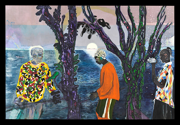 The composition also refers to personal histories— since his youth in Canada, the Scottish-born Doig has been an ice hockey player and avid fan, and the figure on the left of the painting is clad in full ice hockey gear complete with helmet, gloves, and an unexpectedly colorful yellow jersey with red, green and white strokes. The man’s spectral pallor, belligerent stance and the camouflage pattern of his garb make him appear menacing. By contrast, the central figure is inward looking with head bent, as if he may be the hockey player’s opponent (his bright orange jersey is the uniform of the Edmonton Oilers, an ice hockey team from Alberta). A Black man, with a white open-work crocheted cap, the figure was inspired by the paintings of the Haitian painter Hector Hippolyte (1894–1948). The third figure on the right is also a Black man with flowing top knot and dressed in a harlequinesque shirt. Holding a handy cam, his lens is directed at the other two figures, filming the moment as well as poised to record the subsequent action as both voyeur and visual scribe, underscoring the key importance of bearing witness.