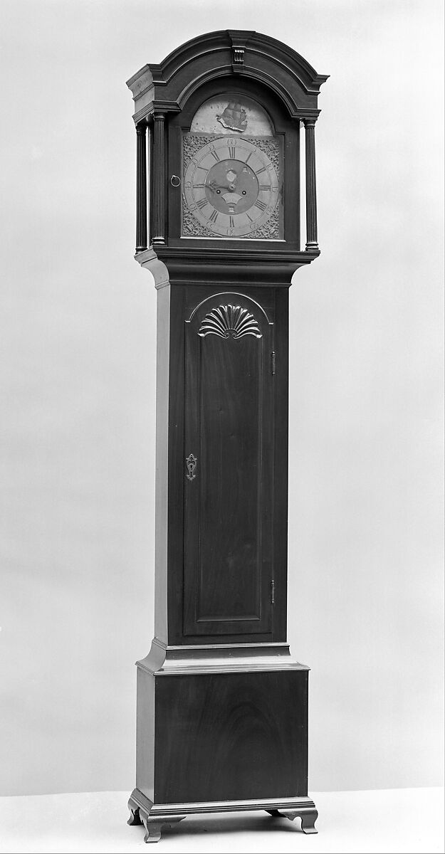 The dial on this clock may represent Gawen Brown's earliest work, since the spandrels feature the urn and eagle common on English dials of the early eighteenth century. This dial was originally square; the top arch was added, probably by Brown himself. Brown's works are usually found in Boston cases, but this one is from Newport, Rhode Island. It is a simpler version of another Newport tall clock in the Museum's collection (27.57.2) with a case made by John Townsend.