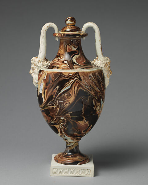 This agate glazed vase with Bacchus-head handles demonstrate the variety of decorating techniques mastered at the factory of Josiah Wedgwood (1730–95) and his partner Thomas Bentley (1730–80) to cater to the demands of the middle-class market in England. New decorative finishes and glazing techniques catered to the demands for novelty. Printed sources such as Jacques Stella’s Livre de Vases played an important role in furnishing classically inspired models for vases such as this one.