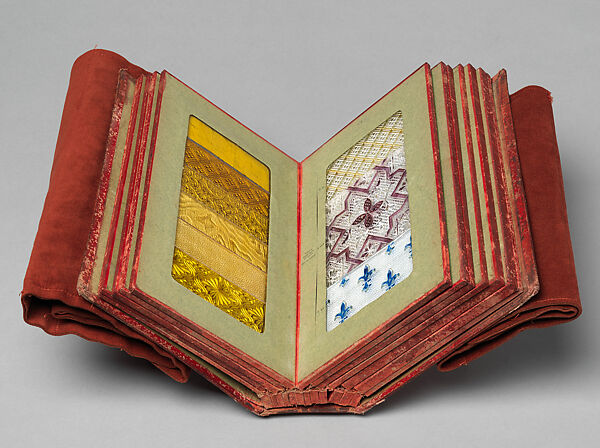 - Medium: Cloth cover binding. Twelve double boards cloth hinged with embedded glass samples