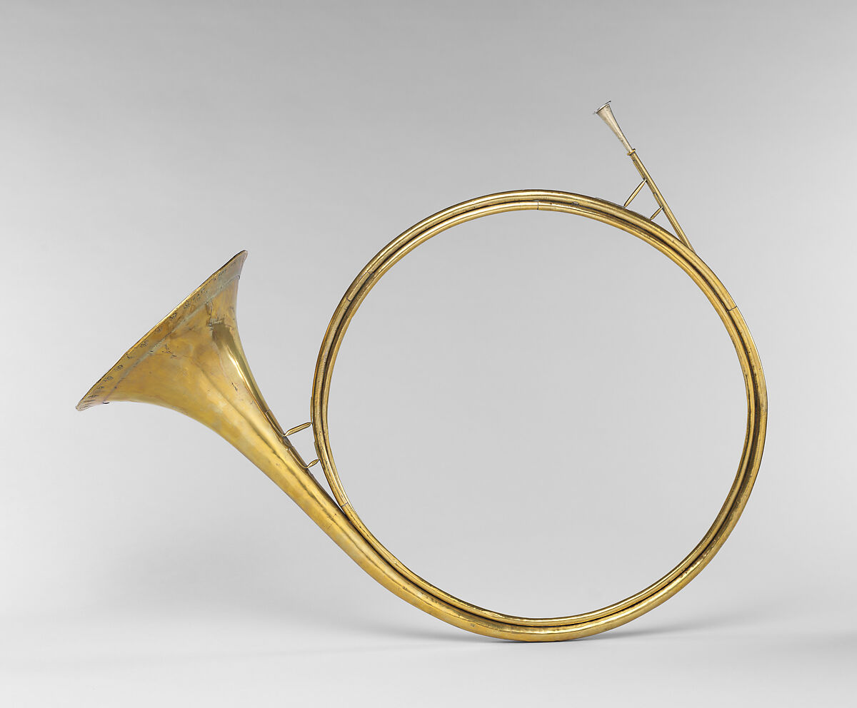 This elegant form of the hunting horn was given the name “trompe Dauphine” because it was adopted as the official hunting horn of the French court the year the Dauphin, future King Louis XV, was born. Horns like this were central to the elaborate and famed hunt at Versailles. The long tube length of the trompe Dauphine (16 foot D) could produce at least 16 notes of the harmonic series, which enabled huntsmen to play a repertoire of intricate calls to keep members of the hunting party apprised of events unfolding in the field. The trompe was also played to entertain listeners before and after the hunt. The sophisticated design and melodic capabilities of these French instruments gave rise to the development of the horn as a musical instrument. Because of the importance of the hunt as a reflection of wealth and noble status, stylized horns were often employed as decorative motifs (see 07.225.147, Louis XV interior)
