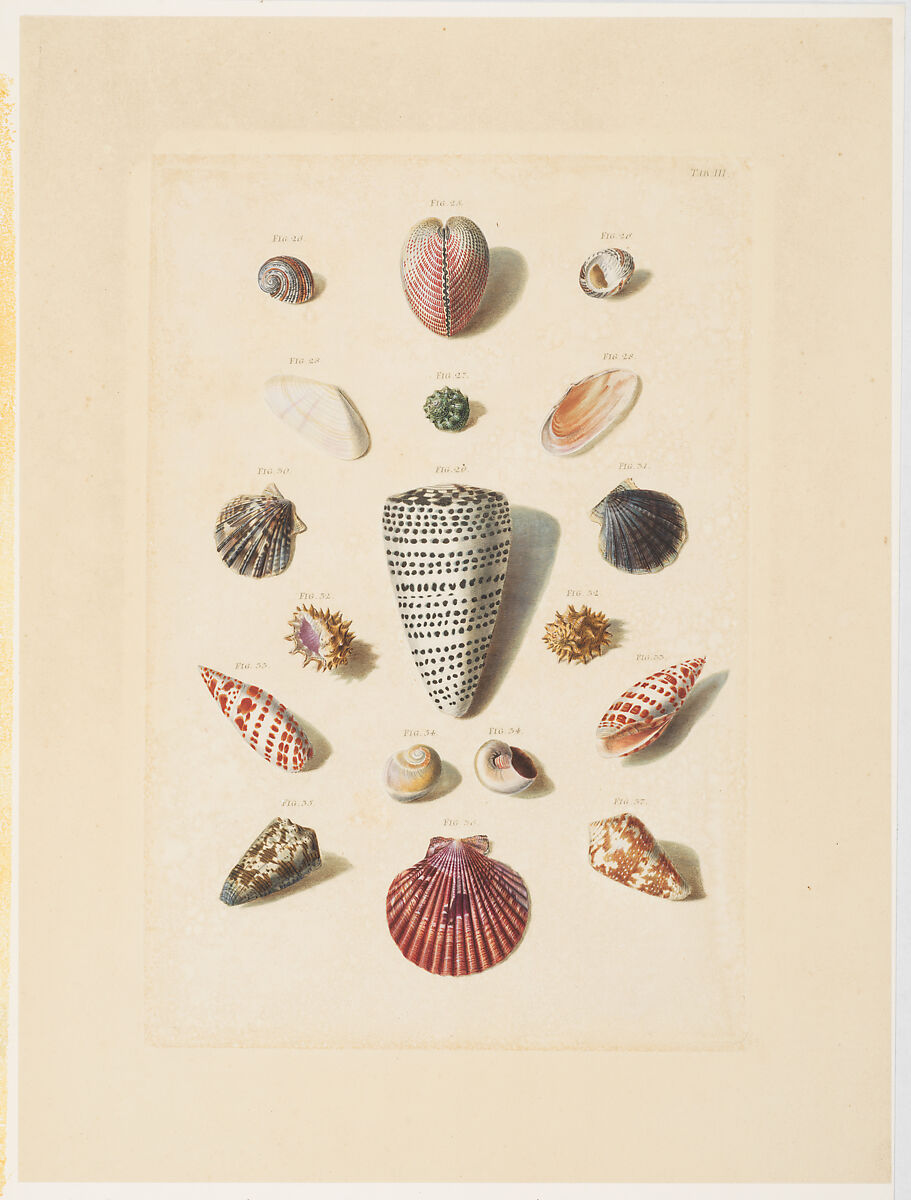 The Nuremberg artist Regenfuss was fascinated by exotic natural-history objects. As early as 1745, he began to plan for an illustrated book dedicated to shells and crustaceans but, due to several setbacks, was not able to realize the project until 1758, after relocating to Denmark. There he found the support of Count Adam Gottlob von Moltke, who had himself compiled a famous cabinet of shells, and who successfully recommended Regenfuss as engraver to the king. Regenfuss’s publication was extremely popular thanks to the unprecedented large size of the prints and the almost three-dimensional effect of the illustrations. The latter feat was achieved through the careful application of color, most of which was done by his wife, Margaretha Helena.