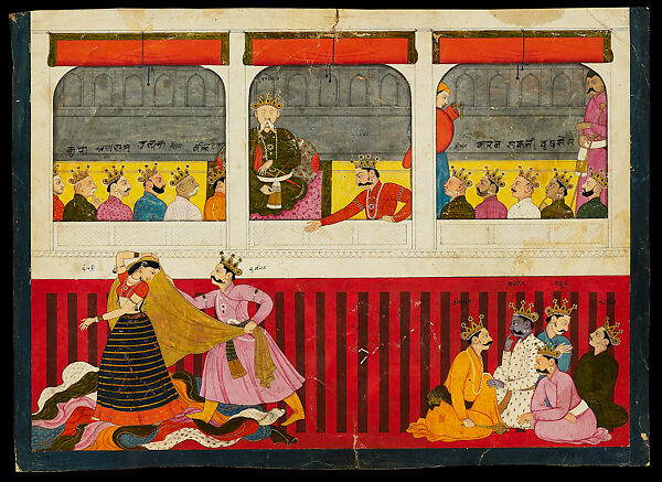 This painting depicts one of the most shocking episodes in the Mahabharata: the attempted disrobing of Draupadi, virtuous wife of the Pandava brothers, after they lose everything in a game of dice. The painter illustrated the moment when Duhshasana tears Draupadi’s clothes from her, only to see them replaced miraculously by new ones, ensuring that Draupadi’s virtue is preserved. As Duhshasana’s fury escalates, so too does the pile of robes on the floor, represented as a wondrous stream of multicolored textiles. Opposite, the humiliated Pandava brothers sit huddled together. One reaches for his weapon to defend Draupadi’s honor, but he is restrained by Yudhishthira, whose recklessness led the clan into this impasse. Above, an arcade opens onto a court scene in which the Kaurava nobility are presided over by the blind king Dhritaraahtra. Each character is named in small inscriptions in the local Takri script