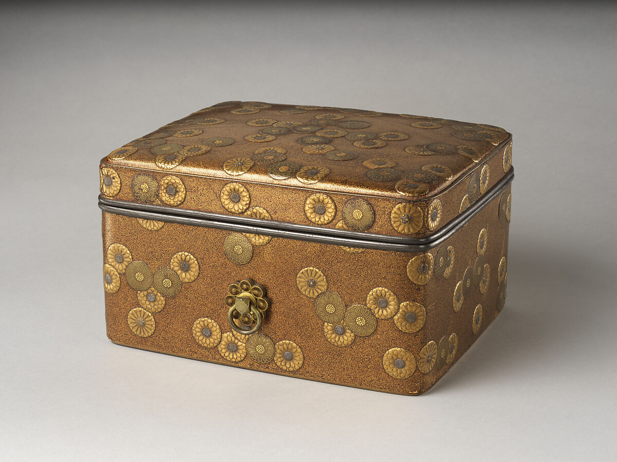 This 15th-century, rectangular, deep box is decorated with gold and silver chrysanthemum flowers executed in raised and flat maki-e on “pear skin” (nashiji) ground. It has two finely crafted gilded metal fittings in the shape of eight chrysanthemums arranged in a circle surrounding a larger flower in the center. The box and its two inner trays—an unusual feature—have metal rims. The trays are also embellished with gold and silver chrysanthemums executed in burnished and flat maki-e on a pear skin ground. The small cosmetic boxes and combs that would have been inside of the box since been lost. The inside is lined with an elegant brocaded silk embellished with chrysanthemums to match the lacquer decoration. Chrysanthemum flowers are a symbol of longevity and good fortune in East Asian art referring to the legend of the Chrysanthemum Boy (Kikujidō).