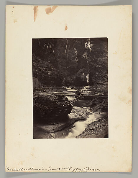 This work of art is currently on loan to the museum.On July 4, 1863, two entrepreneurs opened to paying visitors a natural wonder of silvery cascades, deep ravines, and rocky arcades near the village of Watkins, New York. The wilderness attraction became immediately popular, as an enchanting retreat from both the summer heat and the stark realities of the Civil War. These four views by the Gates Brothers were among the first souvenir photographs sold to the thousands of annual visitors to the site (now Watkins Glen State Park)—a destination that would soon rival for popularity Niagara Falls and the Catskills. The photographers’ portable darkroom is visible to the left of the stream.