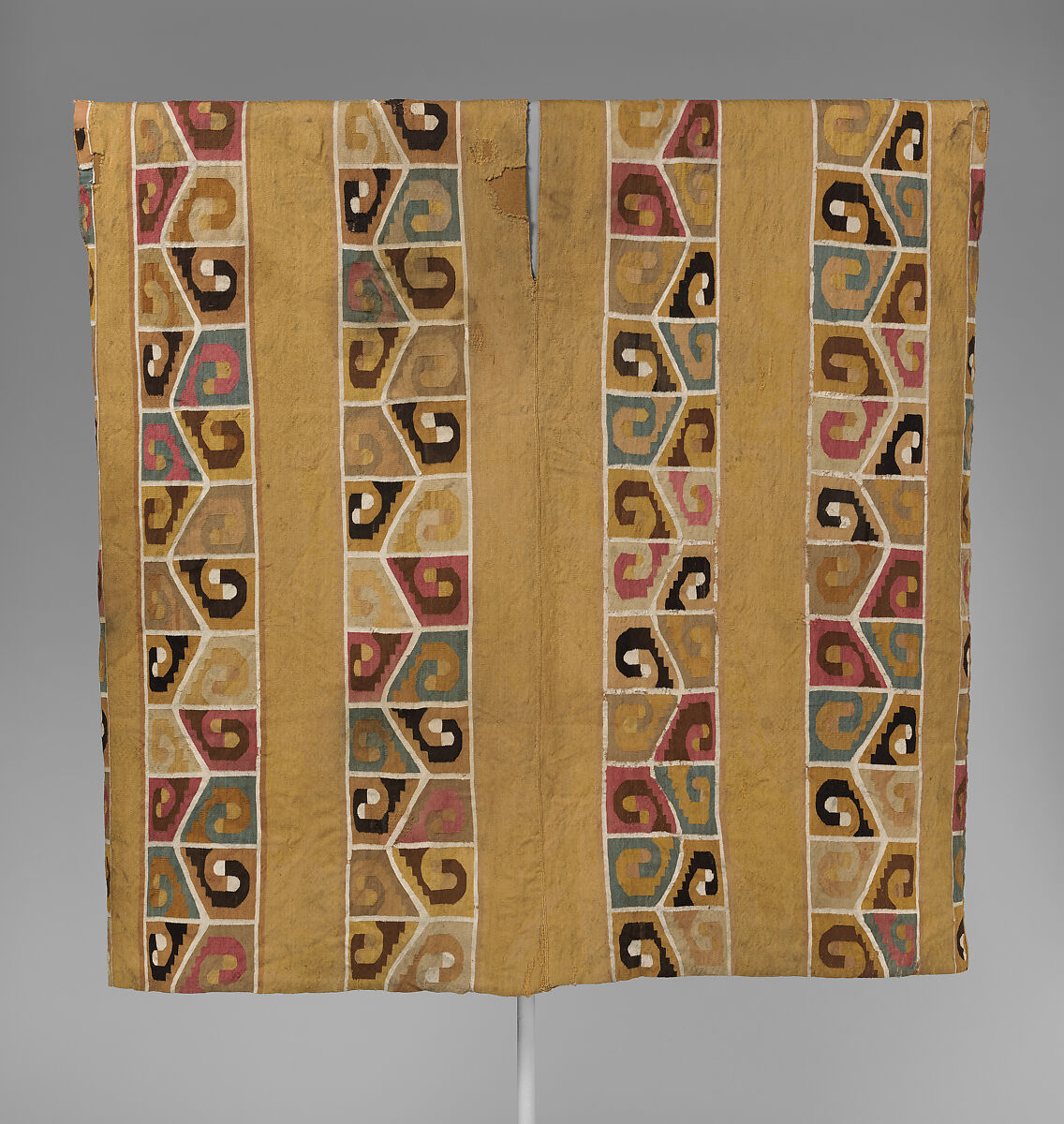 In the Precolumbian Andes, sleeveless tunics reaching to the knees and worn over a loincloth were the primary male garment. Tapestry-woven tunics were the most prestigious, and the finest examples were made of up to eighteen miles of handspun camelid wool. As with those of their successors, the Incas, Wari tunics are standardized in size, format, color, and design, suggesting they were produced in state-sponsored workshops. On this fine tunic, a wavelike motif known as a stepped fret is arranged in registers in vertical bands, separated by a white border. The precise significance of this motif is not known, but the dazzling interplay of harmonious colors—pink, magenta, turquoise, crimson, and brown, against a light brown background, creates a strikingly bold visual statement.
