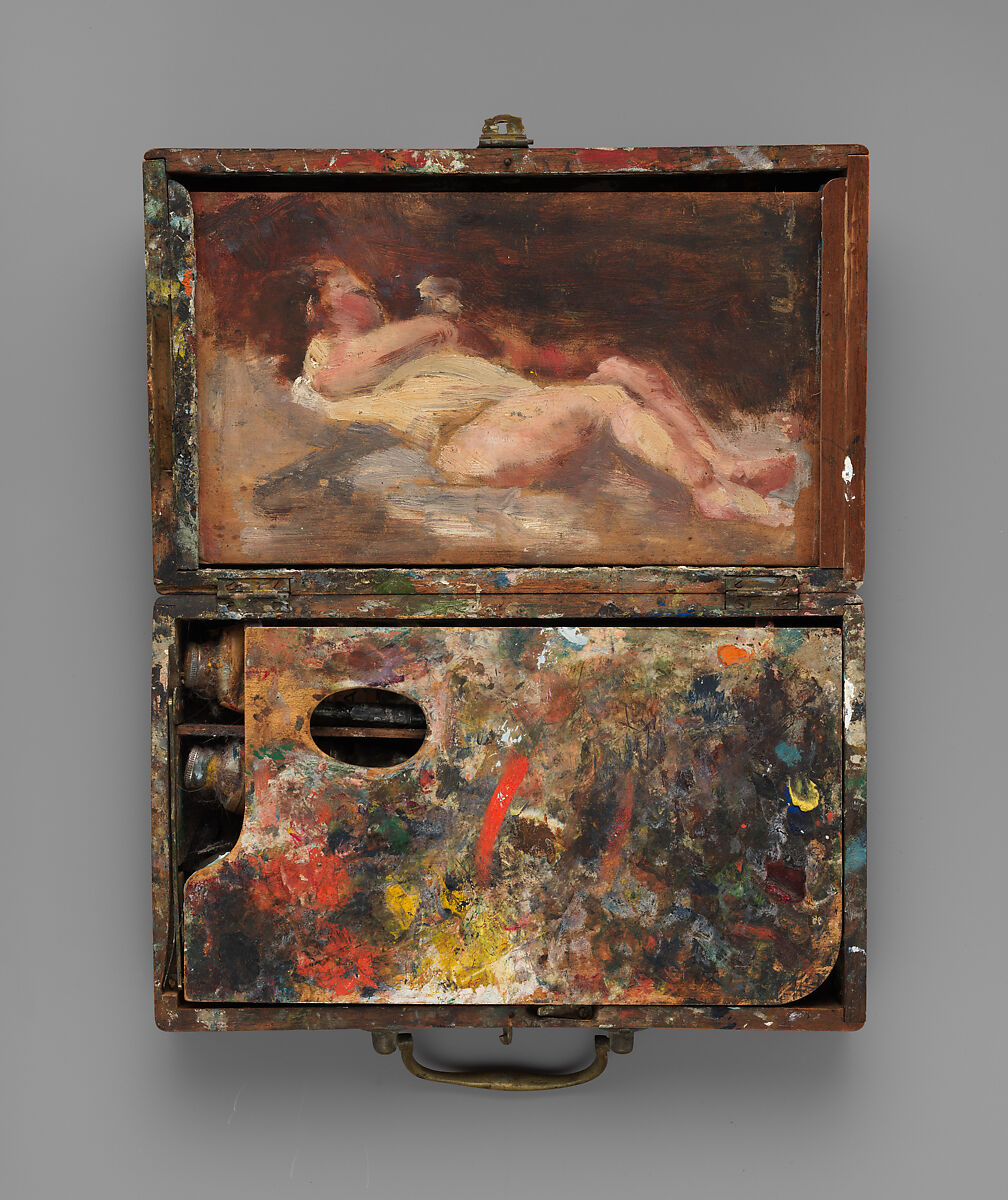 De Kay (later Gilder) is better known for her role as a progressive cultural tastemaker in late nineteenth-century New York than for her paintings. This paint box, a rare survivor of her artistic practice, reveals much about training for women at the time. The nude study dates the work to around 1871, the year when life classes were first open to women at the National Academy of Design. De Kay also studied privately with Winslow Homer and John La Farge, specializing in floral imagery. A magnetic personality, de Kay greatly enriched the progressive cultural landscape through many contributions, including establishing the famous Friday salons at the Gilders’ home near Union Square, organizing a Saturday-morning sketch club, and co-founding both the Art Students League and the Society of American Artists.