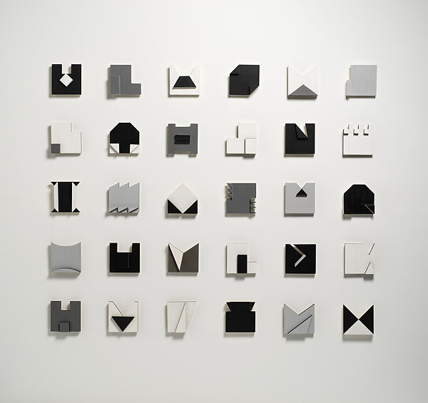 Pape created a series of "books" infused with referencing chronological temporality, in which the physical units emphasize an infinity of variations that question a linear perception of time, as well as challenging the conventions of the picture plane. Like a page in a book, each relief unit in Book of Night and Day is unique in its design. When accumulated, unit and page generate a larger narrative. The many possible arrangements of Book of Night and Day–an orthogonal structure, aligned in one row, or in an explosive fashion–allows for innumerable "readings" by the viewer; these readings are spatial and open-ended in nature.