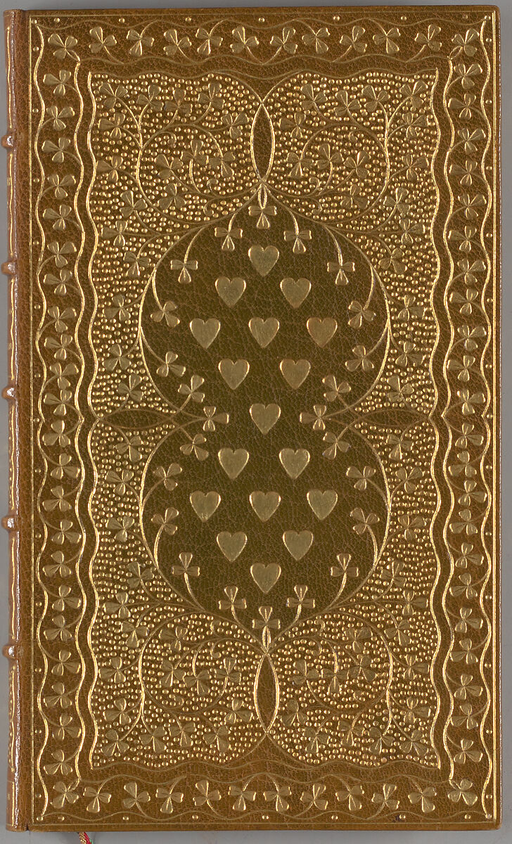 Binding: Brown and green leather with elaborately gilt design include clover leaves and hearts; inner dentelles and mottled endpapers, all edges gilt, yellow/red/green ribbon marker, binder stamped in gold on inside front cover "Stikeman & Co."
