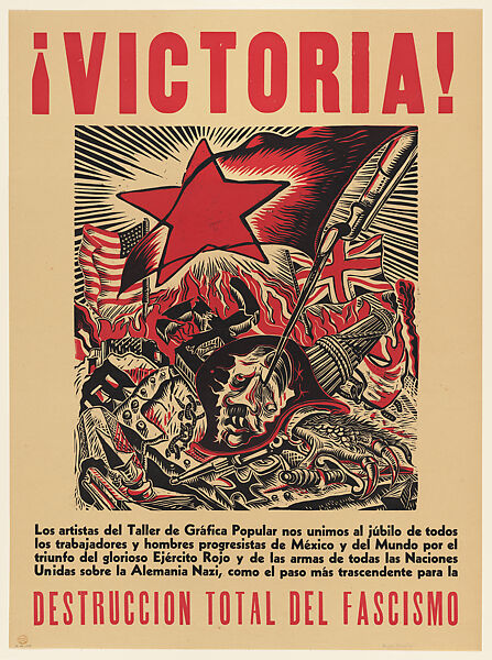 Tras casi cinco años de brutal conflicto, la Segunda Guerra Mundial finalizó con la rendición de Alemania el 8 de mayo de 1945, seguida por la de Japón el 2 de septiembre tras los bombardeos atómicos de Hiroshima y Nagasaki. Este cartel celebra la victoria de los Aliados y el Ejército Rojo soviético y la «destrucción total del fascismo». El triunfo se expresa por medio de unas impactantes imágenes: una bayoneta clavada en la cuenca del ojo de Hitler, escombros caóticos alrededor y, en el fondo, rayos de luz que sugieren un nuevo amanecer. En el texto se describe el júbilo de los artistas del TGP, los trabajadores y todos aquellos que lucharon por el progreso en México.