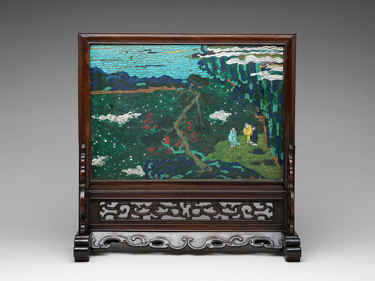 This table screen is among a very rare group of cloisonné enamel paintings of landscapes produced by the imperial Ming workshop. The blues and greens of the landscape evoke a golden age of Chinese painting. The meticulous and elegant treatment of copper wires to represent traditional brushwork demonstrates the successful application of Chinese taste and design to cloisonné, a technique imported from the West one century earlier.