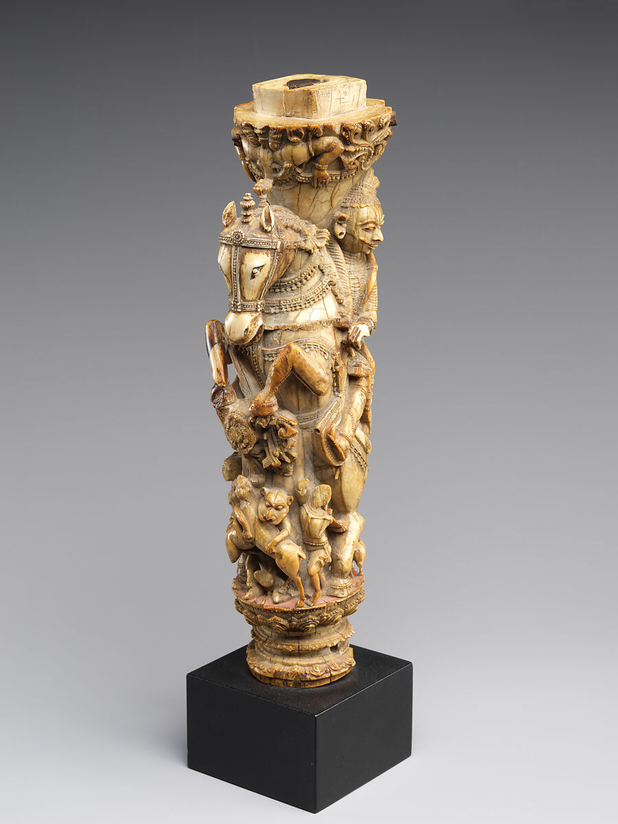This remarkable ivory sculpture is one of a set of four throne legs, now dispersed. Like its companions, it is distinguished by its superb sculptural quality. The equestrian warrior is seen in dynamic action, the spectacular rearing horse and his princely rider moving as one in ferocious combat. The royal rider displays a large sectarian forehead mark (tilka) that proclaims his devotion to Vishnu.