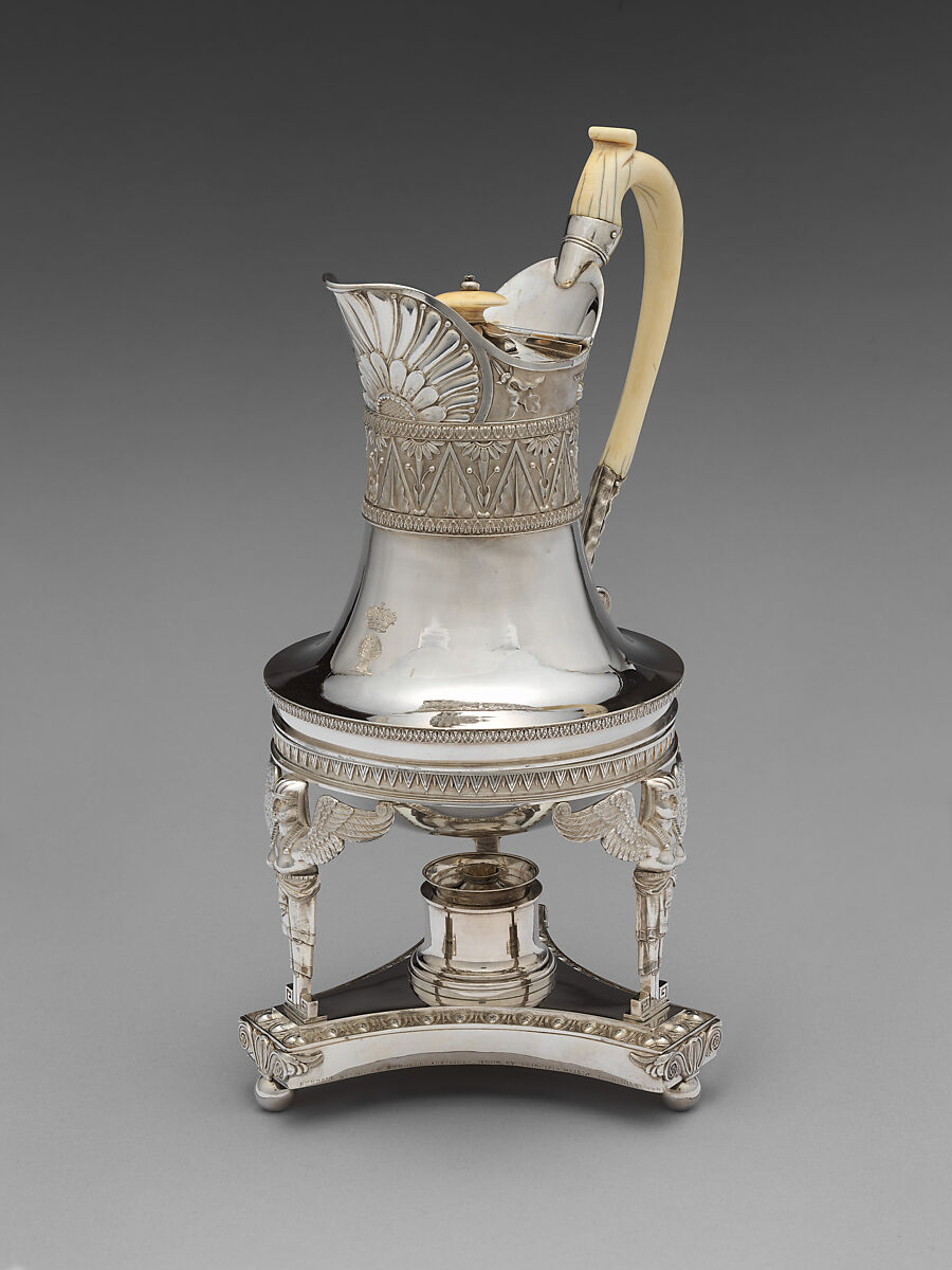 The service itself was made between 1804 (tea urn, milk jug and sugar bowl) and 1805 (teapot and coffeepot on stand) by the partnership of Digby Scott and Benjamin Smith II, active together between 1802 and 1807. The most imposing element of the service is a large and heavy tea urn, which is closely associated with a design in the collection of the Victoria & Albert Museum by Jean-Jacques Boileau, who was one of several Frenchmen who came to London in the aftermath of the Peace of Amiens of 1802 to be employed by the Francophile future Prince Regent for the decoration of Carlton House. At least seven urns of the same design can be traced, all of which are associated with the collections of high-ranking court officials or significant arbiters of taste, such as Thomas Hope, a vanguard of Britain’s aesthetic engagement with Ancient Egypt. The Met’s version appears to be the earliest example.