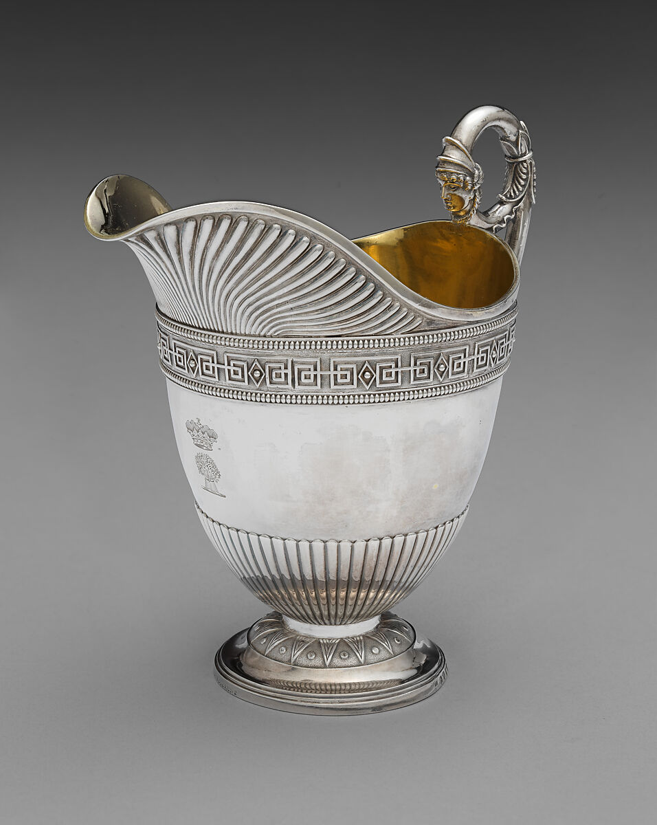 The service itself was made between 1804 (tea urn, milk jug and sugar bowl) and 1805 (teapot and coffeepot on stand) by the partnership of Digby Scott and Benjamin Smith II, active together between 1802 and 1807. The most imposing element of the service is a large and heavy tea urn, which is closely associated with a design in the collection of the Victoria & Albert Museum by Jean-Jacques Boileau, who was one of several Frenchmen who came to London in the aftermath of the Peace of Amiens of 1802 to be employed by the Francophile future Prince Regent for the decoration of Carlton House. At least seven urns of the same design can be traced, all of which are associated with the collections of high-ranking court officials or significant arbiters of taste, such as Thomas Hope, a vanguard of Britain’s aesthetic engagement with Ancient Egypt. The Met’s version appears to be the earliest example.