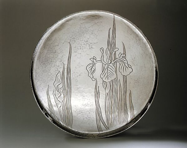In the late 1870s, boldly scaled naturalistic motifs such as this iris design were popular in Tiffany Japanesque silver. The hammered finish seen here was introduced by Tiffany & Company in 1876 and reflected the interest in the surface textures of Japanese metalwork. The tray’s texturing was applied with a punch worked around the iris design and was not the result of the hammering up of the form. Here the hammered effect is combined with pebbling and oxidation, some of which has been lost. This round tray form, introduced in 1878–79, was available in six sizes and many ornamental schemes.