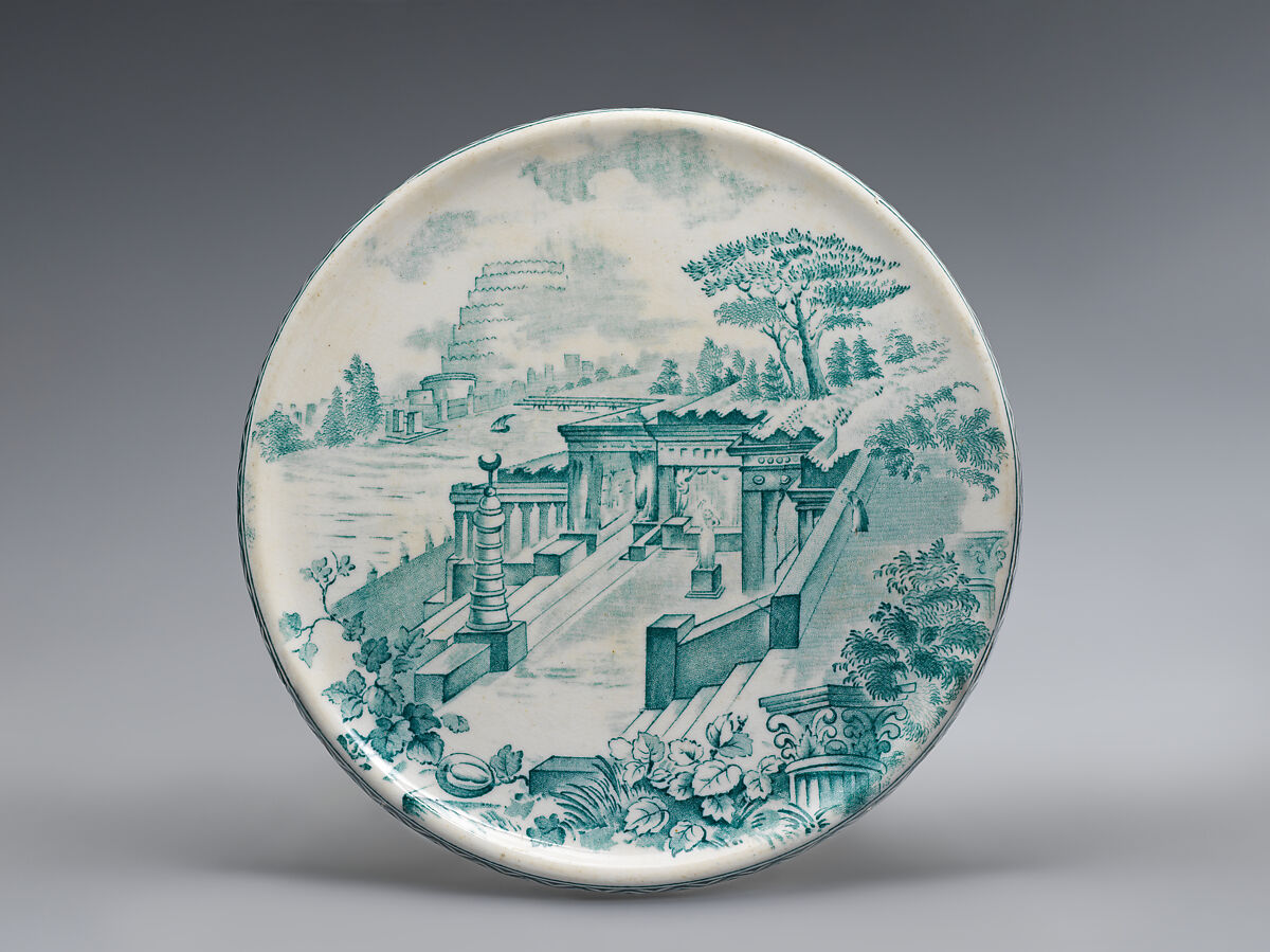 The story of the hanging gardens of Babylon, known in different forms from multiple ancient Greek and Latin authors, inspired a variety of speculative reconstructions and imaginative visions. The design for the hanging gardens as shown here is ultimately derived from that of the British artist John Martin, whose huge 1819 painting The Fall of Babylon was adapted into a popular lithograph. Martin was working before the excavations in Mesopotamia, and used a combination of Roman, Egyptian, and Indian sources to imagine Babylonian architecture. His works were apocalyptic in tone and depicted catastrophic events, but here the setting has been adapted into the opposite: an ancient idyll, with a figure looking out from the hanging gardens across the River Euphrates to the towering Temple of Bel described by Herodotus, which in European art was sometimes conflated with the Tower of Babel.