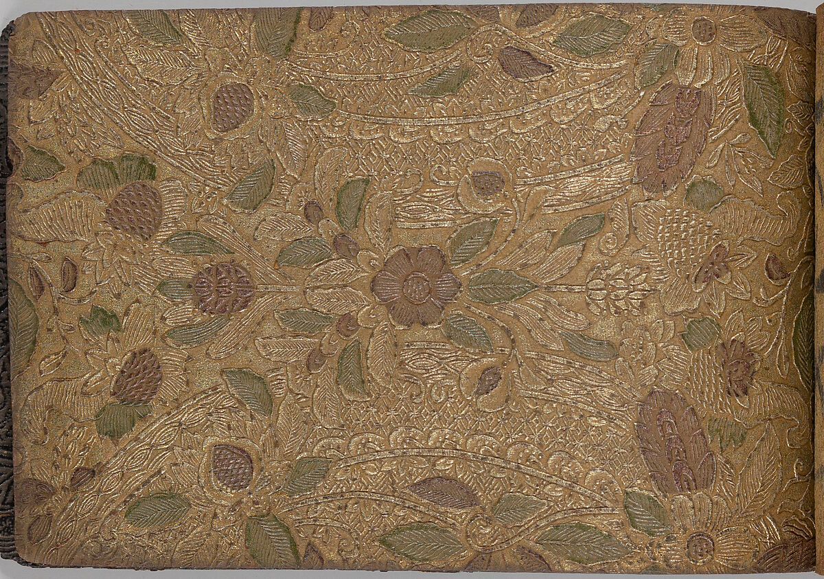 "Unpublished sample book, ca. 1875. Small oblong folio with 72 individual examples of Japanese embossed 'leather' paper." -- From Dieter Schierenberg B.V.'s website, accessed on 5/17/2016.