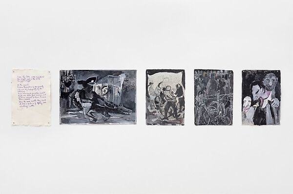 In this series of drawings devoted to the city of Cairo, the artist laments the squandering of riches historically represented by the Nile River. She depicts impoverished residents pillaging ancient artifacts and other treasures from the mud of the riverbanks. These images refer to the "Eighteen Days" in which protests erupted in Tahrir Square—minutes from the Nile—against the police-state, leading to the removal of then-President Hosni Mubarak in 2011. Drawing parallels between the fate of the country’s material heritage and its human potential, the series unfolds as a sequence of snapshots. Protestors appear as faceless crowds, while individuals aligned with the police and military forces that coordinated attacks on the Square resemble grotesques in a manner that recalls the bitingly satirical figures of James Ensor. A crocodile recurs twice: summoning an ancient god of the dead who—indifferent to human suffering—thrives against the backdrop of ransacked museums and murdered youth in the Square.