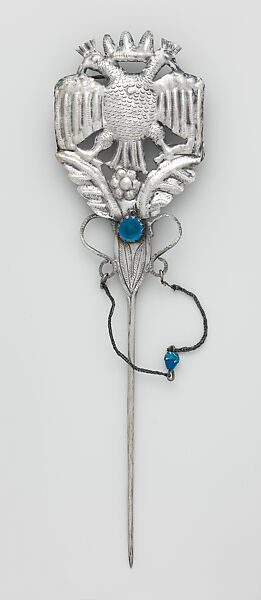 This pin, used to secure a woman’s shoulder cloth or mantle, features a tapering shaft surmounted by a repoussé and chased plaque in the shape of a double-headed eagle. The upper part of the shaft, which is engraved with leaf designs, widens to form a base for the plaque. The scrolls attached to the either side of the upper shaft visually balance the object and also serve as hooks to which chains and other decorations may have been attached. Here, only a single complete chain, attached to the left-hand scroll and decorated with a blue bead, remains; a fragment of chain is attached to the right-hand scroll. At the junction of the shaft and the plaque is a blue, faceted paste (leaded glass) gem held in place with thirteen prongs.