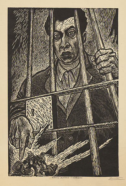 A militant social activist and committed Communist, David Alfaro Siqueiros was imprisoned at different times during his life. In 1960, he was arrested and incarcerated in Mexico City’s Lecumberri prison for openly criticizing the president and for leading protests against the arrests of striking workers and teachers (charges that were known to be false). In this print, protruding through the bars, the artist’s right hand points to a scene of a rich man wearing a top hat standing over a worker next to a bag inscribed "sulfur lead and zinc." This is a reference to the export of the country’s valuable mineral resources, the rewards of which did not benefit the Mexican miners who labored to extract it.