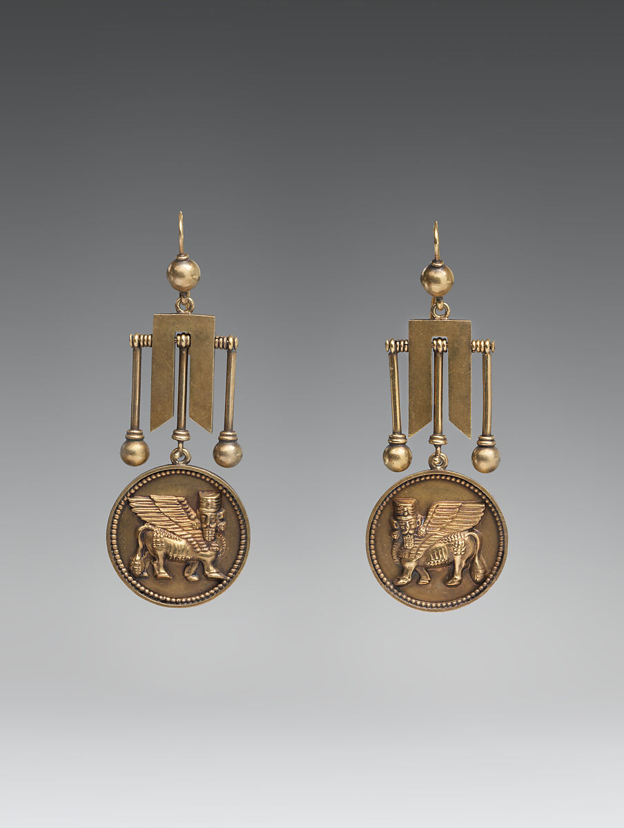 These earrings are part of a demi-parure with brooch (2023.679), all three pieces featuring one of the human-headed winged bull gateway guardian figures that would become the modern icons of the ancient Assyrian palaces.
