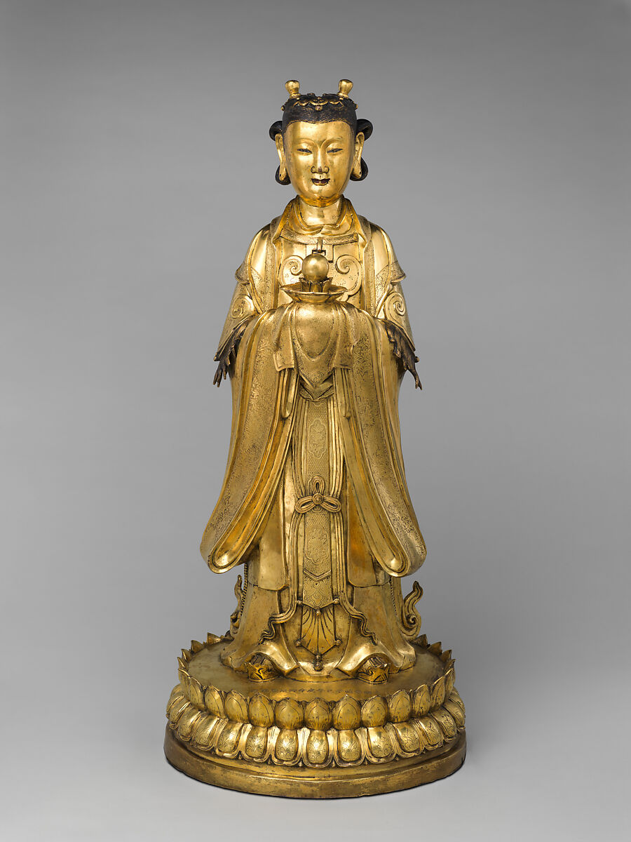 Dragon Girl, the daughter of the Dragon King, was believed to have achieved enlightenment at the age of eight, becoming an acolyte of Guanyin, the Bodhisattva of Compassion. Here, she is portrayed as a serene young girl wearing elaborate courtly robes and holding a tray bearing a precious pearl, a symbol of Buddhist enlightenment. She stands on a lotus pedestal that bears an inscription identical to the one on the young male Sudhana. Originally, they formed a pair of attendants flanking a now-lost image of Guanyin. Together, they demonstrate the superb craftsmanship maintained by the imperial workshops at the end of the Ming dynasty (1368–1644).