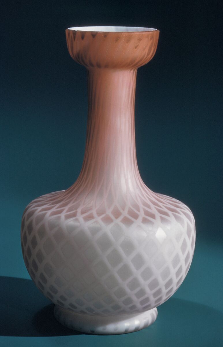 This satin-glass vase, decorated with a diamond-shaped "air trap" pattern, may have been made by the Phoenix Glass Company of Monaca, Pennsylvania.