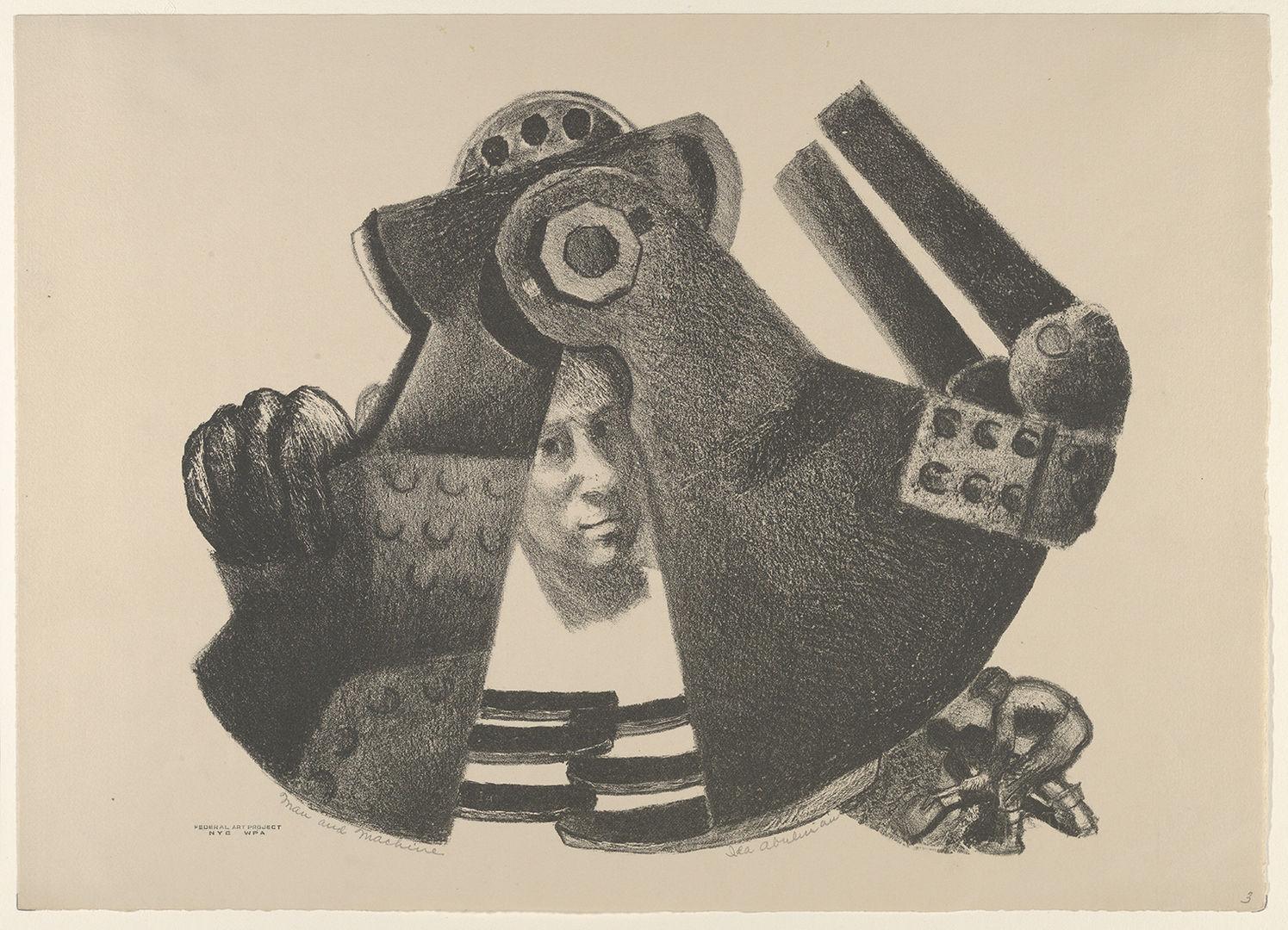 Ida York Abelman (American, 1910–2002). Man and Machine, ca. 1939. Lithograph, 111/2 × 16 in. (29.2 × 40.6 cm). The Metropolitan Museum of Art, New York, Gift of New York City W.P.A., 1943 (43.33.34)