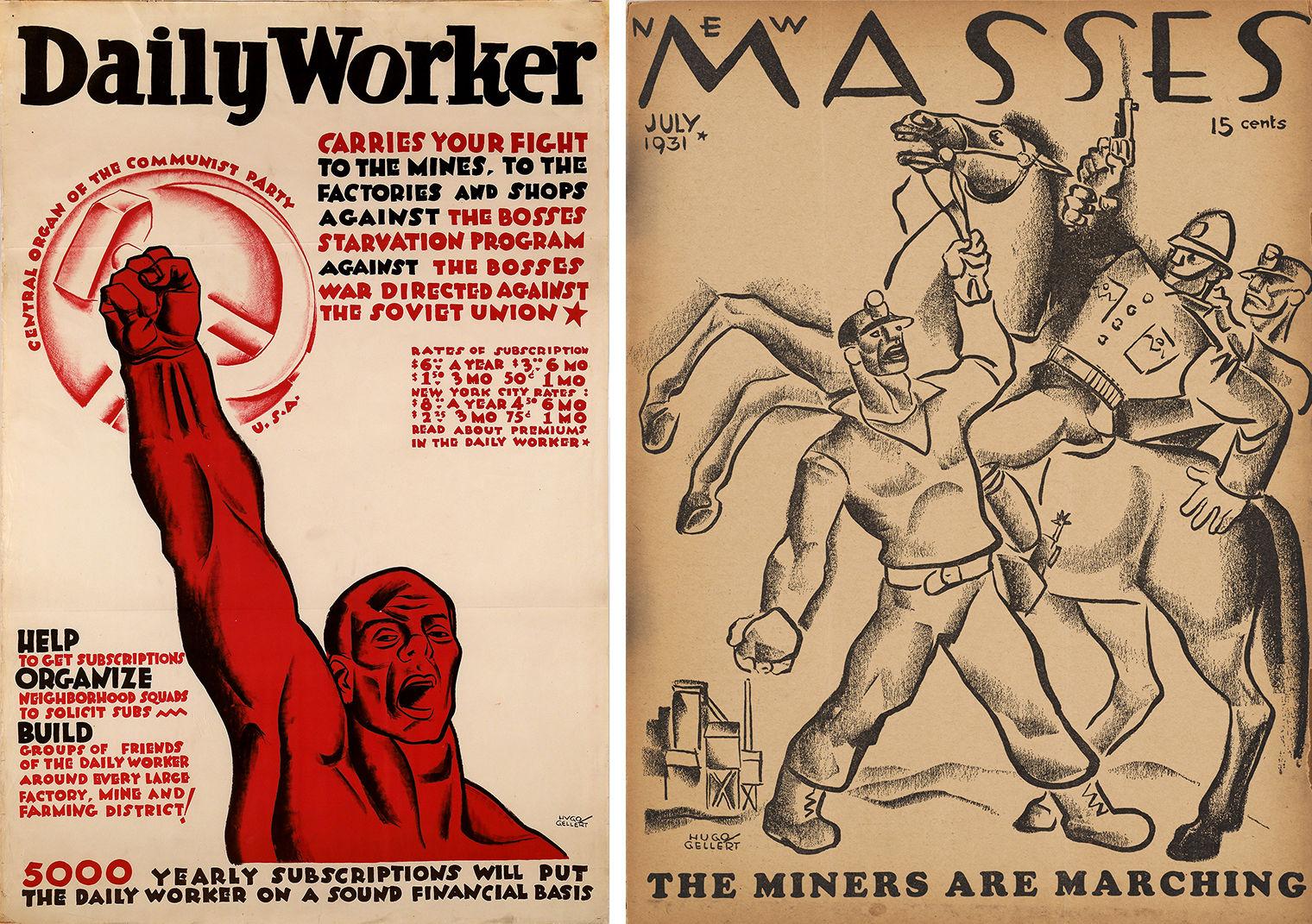 Left: Hugo Gellert (American, born Hungary, 1892–1985). Daily Worker poster (ca. 1935). Lithograph. 381/8 × 251/4 in. (96.8 × 64.1 cm). Merrill C. Berman Collection, Rye, N.Y. Right: Cover by Hugo Gellert (American, born Hungary, 1892–1985). New Masses, July 1931. Photomechanical relief print, 111/2 × 83/4 in. (29.2 × 22.2 cm). The Metropolitan Museum of Art, New York, Purchase, Friends of Drawings and Prints Gifts, 2022 (2022.110)