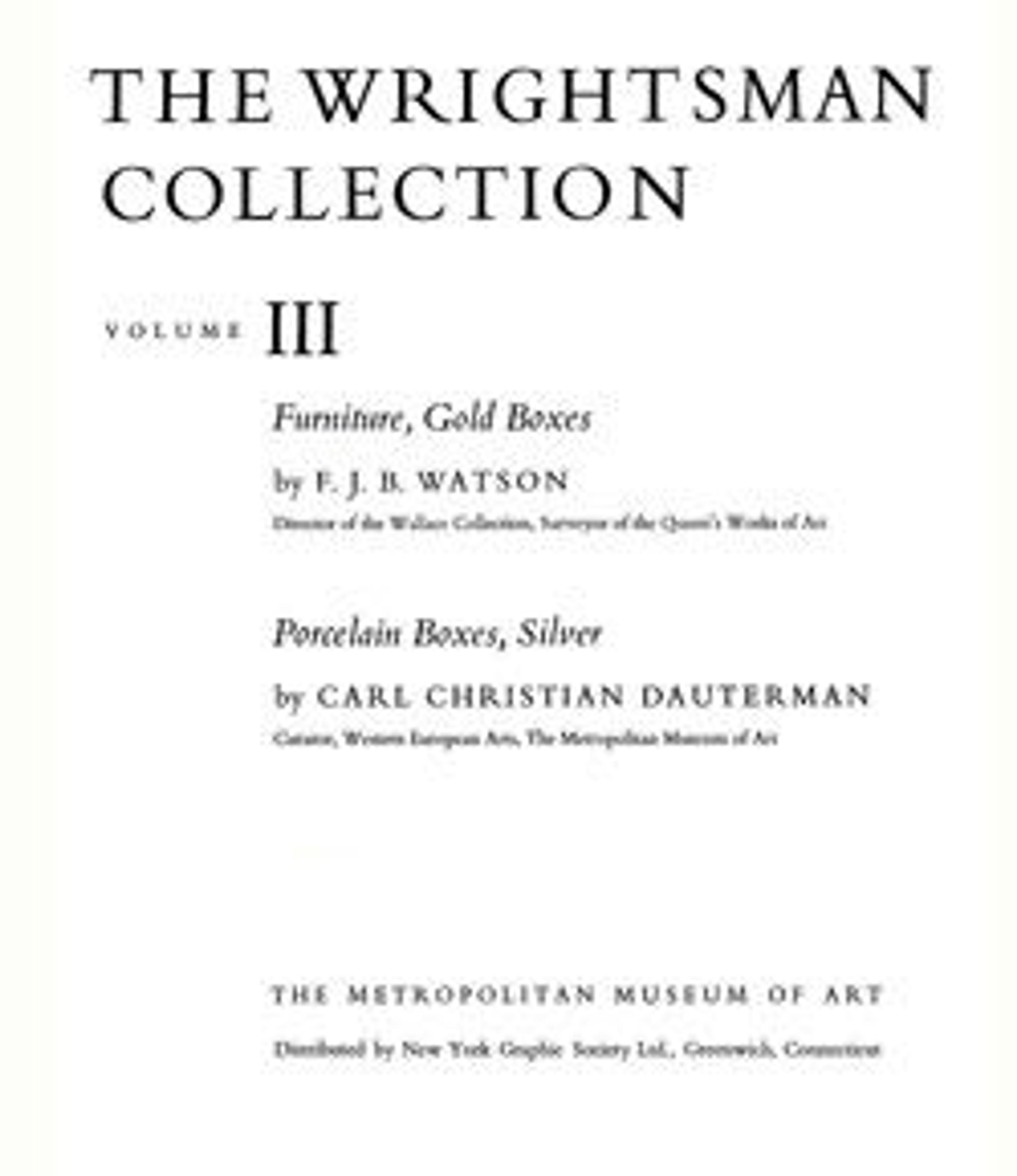 Watson, Francis J. B., and Carl Christian Dauterman, eds. 1970. The Wrightsman Collection. 3: Furniture, Gold Boxes / by F. J. B. Watson. Porcelain Boxes, Silver by Carl Christian Dauterman. New York: Metropolitan Museum of Art.