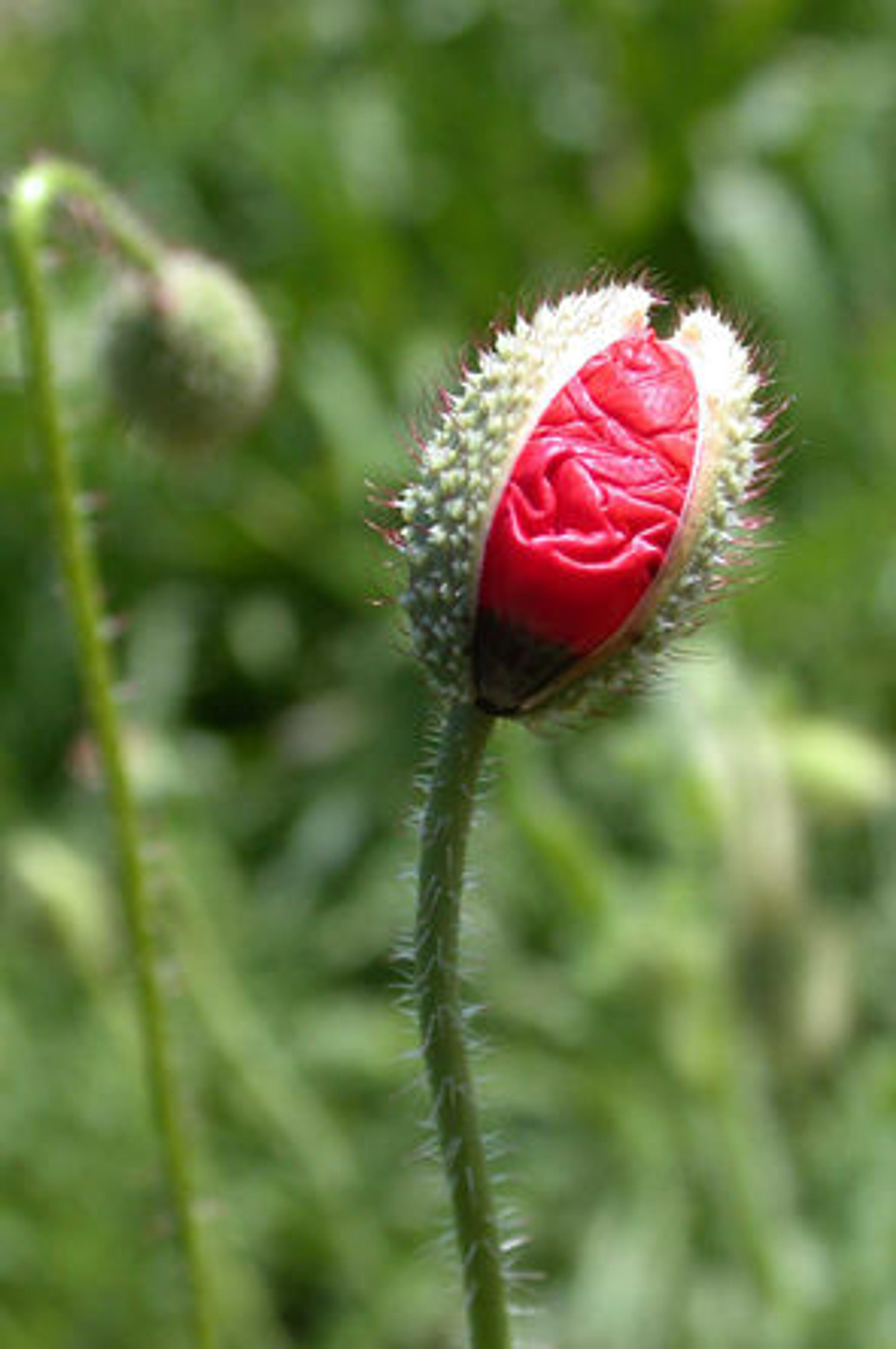 Left: The distinctive, crinkled red petals of the corn poppy ensconced in a bud