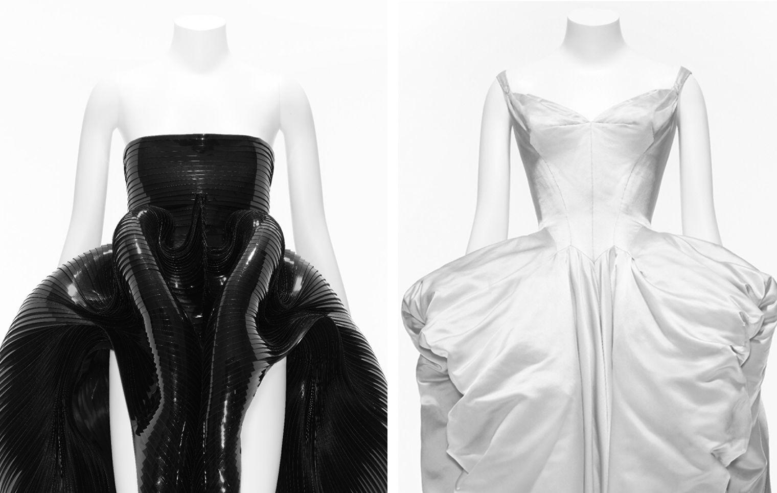Minute 57 of 60. Left: Iris van Herpen. Dress, Autumn/Winter 2012–13 Haute Couture. Gift of Iris van Herpen, in honor of Harold Koda, 2016 (2016.185). Right: Charles James. Ball Gown, 1951. Brooklyn Museum Costume Collection at The Metropolitan Museum of Art, Gift of the Brooklyn Museum, 2009; Gift of Mr. and Mrs. Robert Coulson, 1964 (2009.300.1311). Photographs © Nicholas Alan Cope