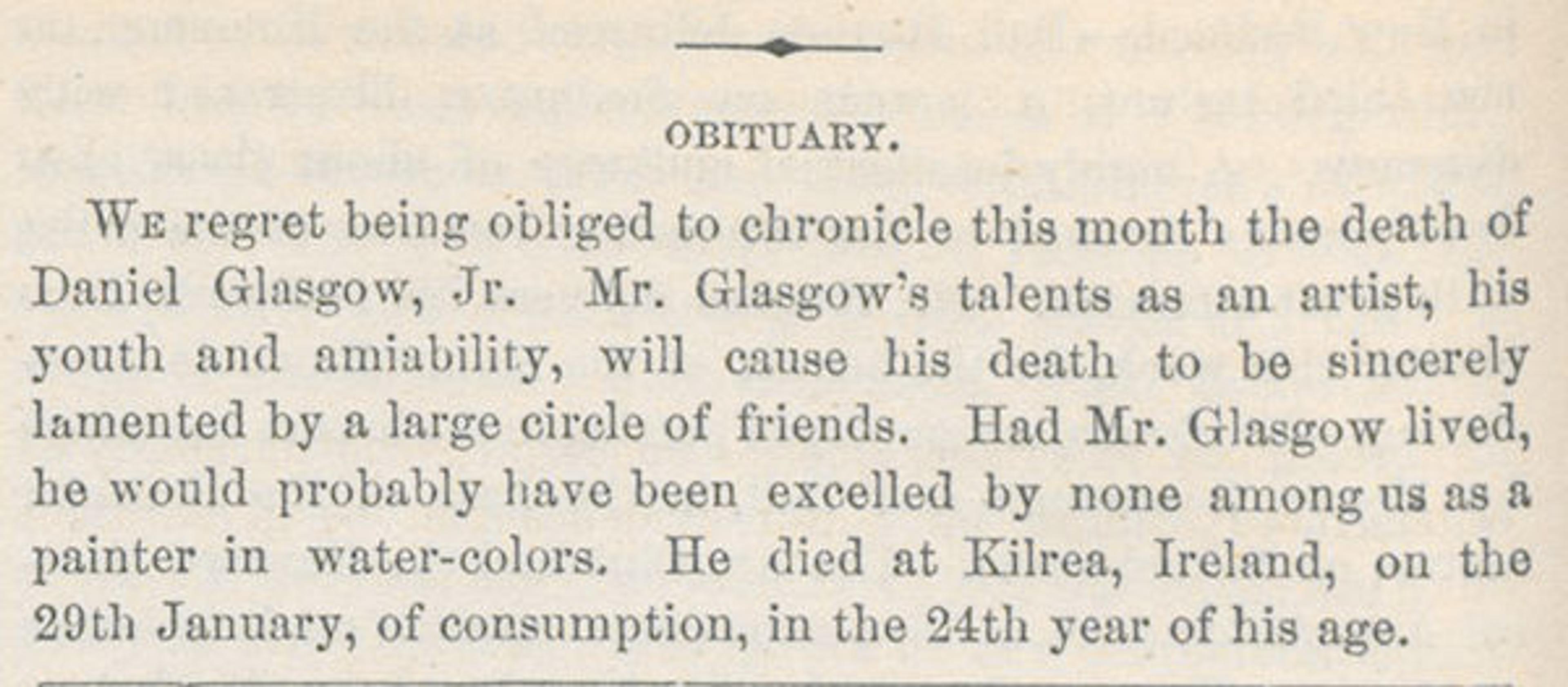 We regret being obliged to chronicle this month the death of Daniel Glasgow, Jr. Mr. Glasgow's talents as an artist, his youth and amiability, will cause his death to be sincerely lamented by a large circle of friends. Had Mr. Glasgow lived, he would probably have been excelled by none among us as a painter in water-colors. He died at Kilrea, Ireland, on the 29th of January, of consumption, in the 24th year of his age.