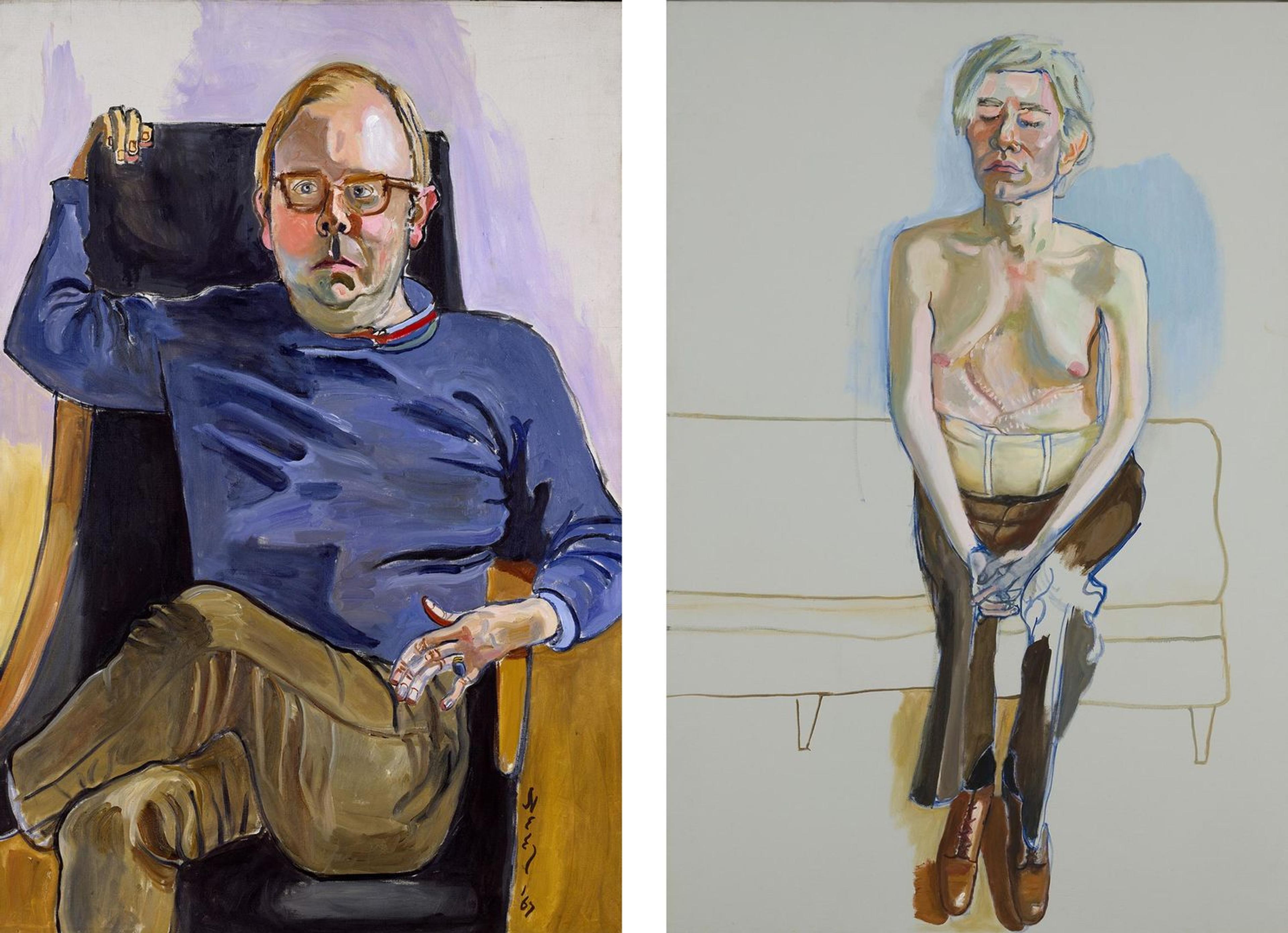 Left: Alice Neel (American, 1900–1984). Henry Geldzahler, 1967. Oil on canvas, 50 × 34 in. (127 × 86 cm). The Metropolitan Museum of Art, New York, Anonymous Gift, 1981 (1981.407). Image © The Estate of Alice Neel. Right: Alice Neel (American, 1900–1984). Andy Warhol, 1970. Oil and acrylic on linen, 60 × 40 in. (152.4 × 101.6 cm). Whitney Museum of American Art, New York, Gift of Timothy Collins. Image © The Estate of Alice Neel