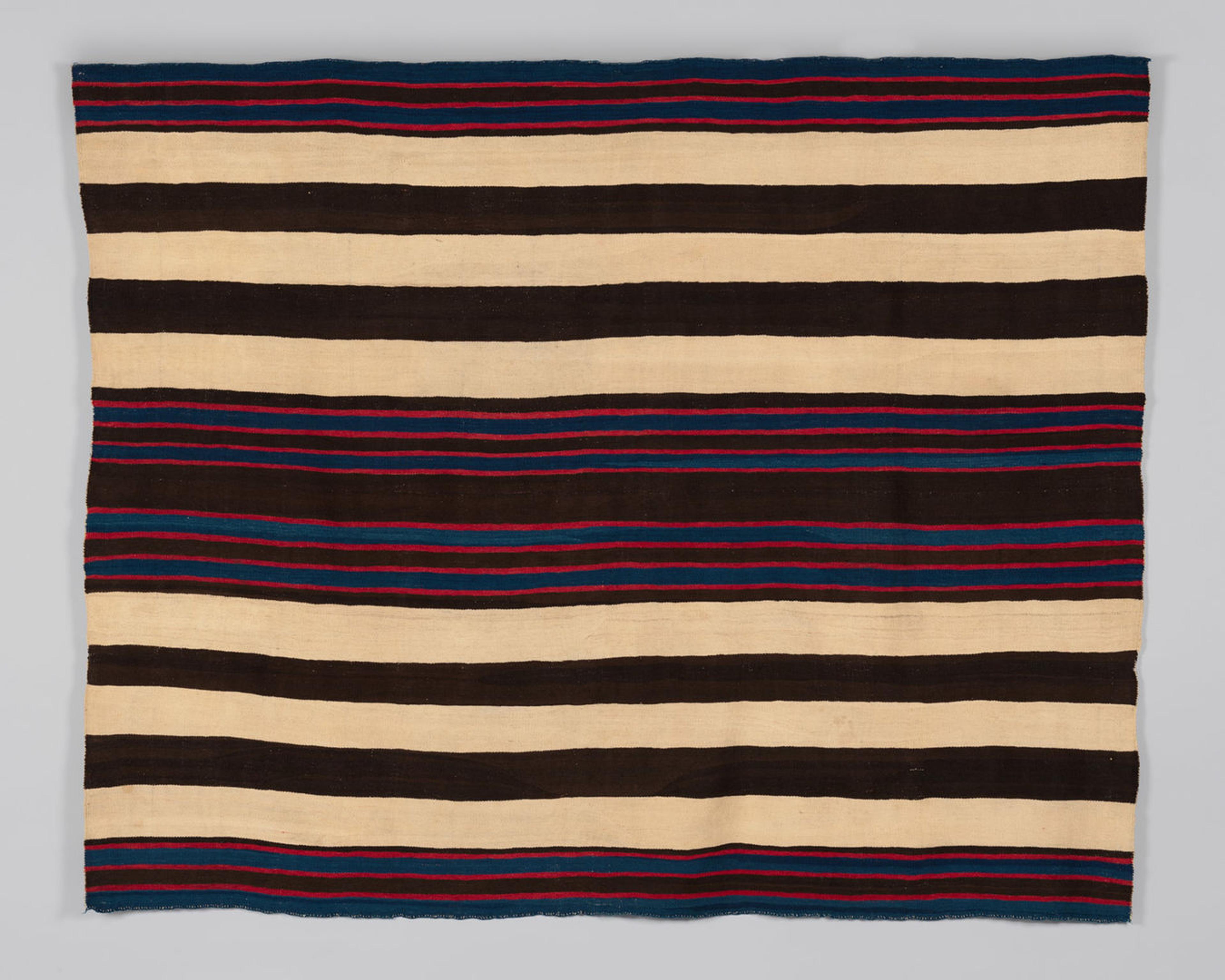 Diné / Navajo artist. First-phase chief's blanket. Arizona or New Mexico, United States, ca. 1840. Handspun undyed and indigo-dyed Churro fleece and raveled lac-dyed bayeta, 58 x 68 in. (147.3 x 172.7 cm). Loan from the Charles and Valerie Diker Collection