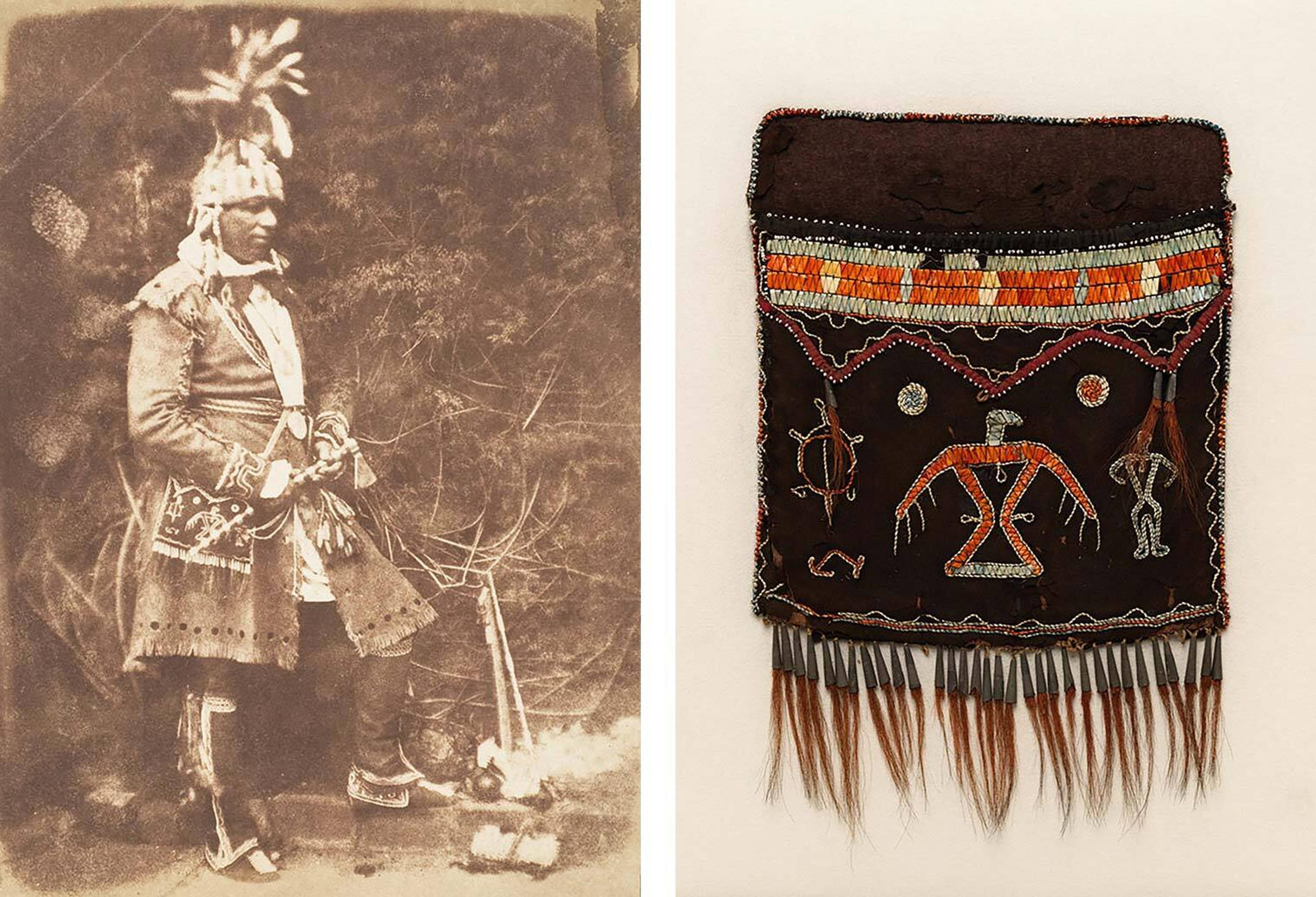 Left: Hill and Adamson (British, active 1843–1848); David Octavius Hill (British, 1802–1870) and Robert Adamson (British, 1821–1848). Rev. Peter Jones, 1845. Salted paper print from paper negative, 7 3/4 x 5 1/2 in. (19.7 x 14 cm). The Metropolitan Museum of Art, New York, Purchase, Harris Brisbane Dick Fund, 1937 (37.98.1.84). Right: Anishinaabe artist, possibly Mississauga Ojibwe. Shoulder bag (missing strap). Ontario, Michigan, or Wisconsin, ca. 1800. Native-tanned leather, porcupine quills, dye, glass beads, silk ribbon, metal cones, and deer hair, 12 x 9 in. (30.5 x 22.9 cm). The Metropolitan Museum of Art, New York, The Charles and Valerie Diker Collection of Native American Art, Promised Gift of Charles and Valerie Diker
